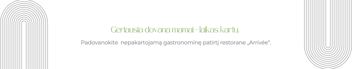 Artėjant Motinos dienai kviečiame nustebinti jas ypatinga dovana – gastronomine vakariene arba vėlyvaisiais pusryčiais mūsų restorane. „Arrivée“ dovanų kuponas – tai kvietimas laikui kartu, kupinam jaukių pokalbių ir naujų skonių. Dovanokite įsimintiną patirtį ir nuoširdų dėmesį – leiskite mūsų šefų kūriniams pažadinti dar neatrastus pojūčius ir sukurti nepamirštamas akimirkas.